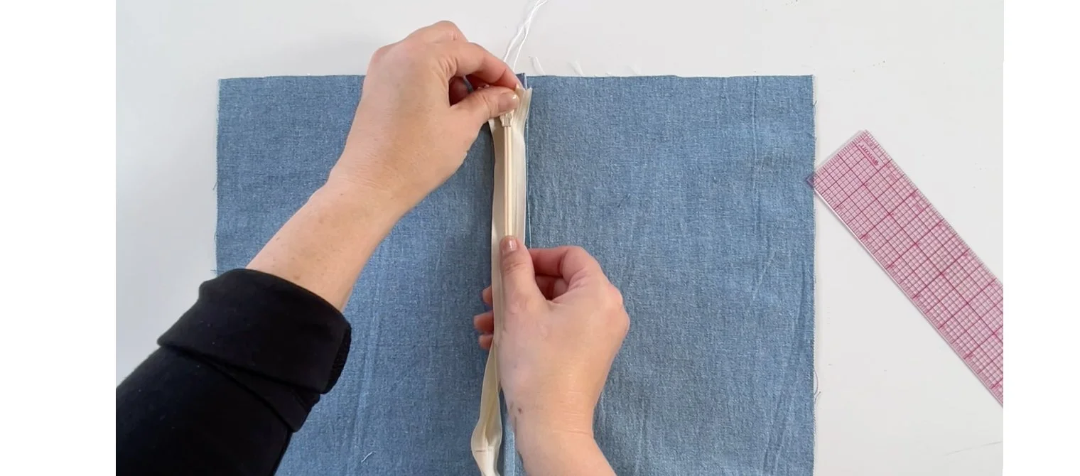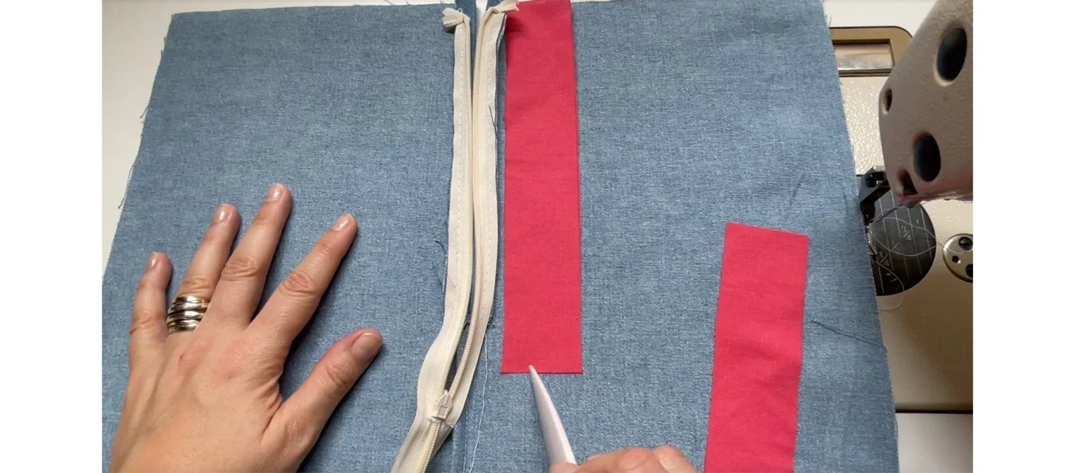 Trim to fit: you may have a zipper in your stash, but it is much too long. We demonstrate how to trim it to fit the opening and how to finish the cut end neatly. Use an invisible zipper that is 1”-2” longer that the opening.