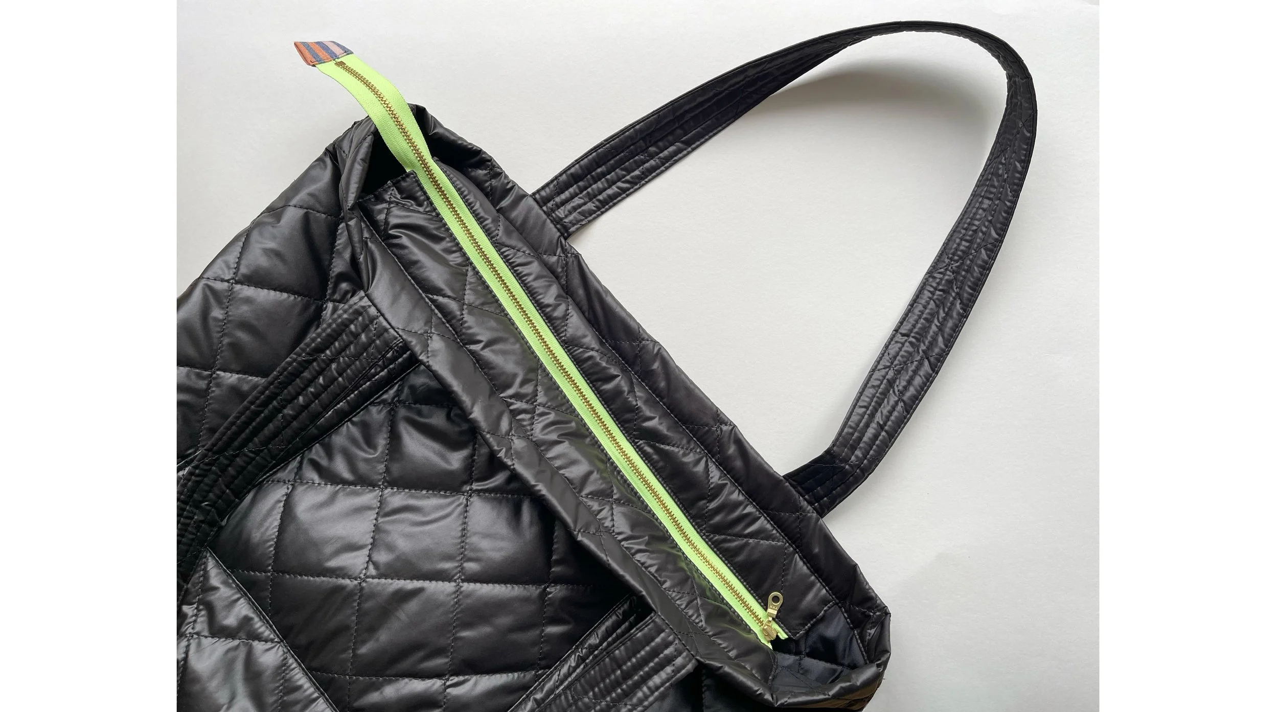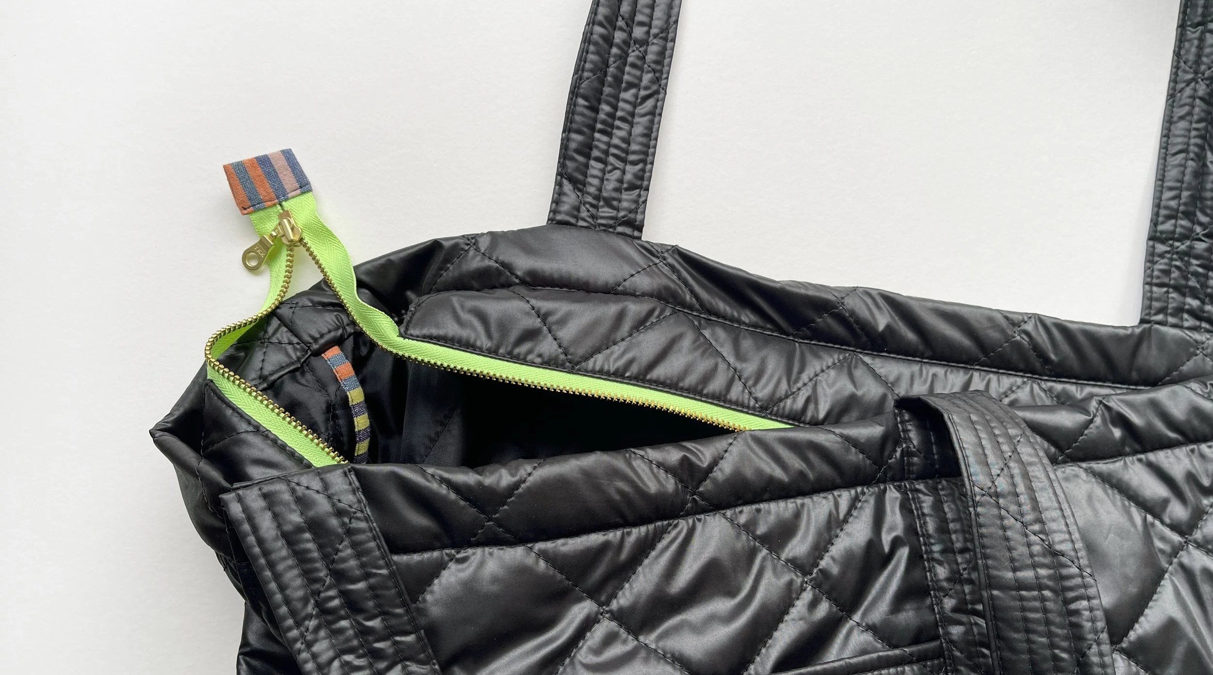 I rummaged through my stash and found some leftover striped cotton that perfectly complemented the fluorescent green zipper. I used it to bind the side seams of the tote—a finishing detail I'd nearly forgotten about until this lucky scrap bin discovery saved the day. The original Remote Tote instructions include tips for managing heavyweight fabrics, but this quilted nylon was surprisingly easy to work with and made binding those seams a breeze. Finally, I used the same striped fabric for the zipper pull tab, which turned out to be the perfect finishing touch that tied all the materials together into a cohesive design.