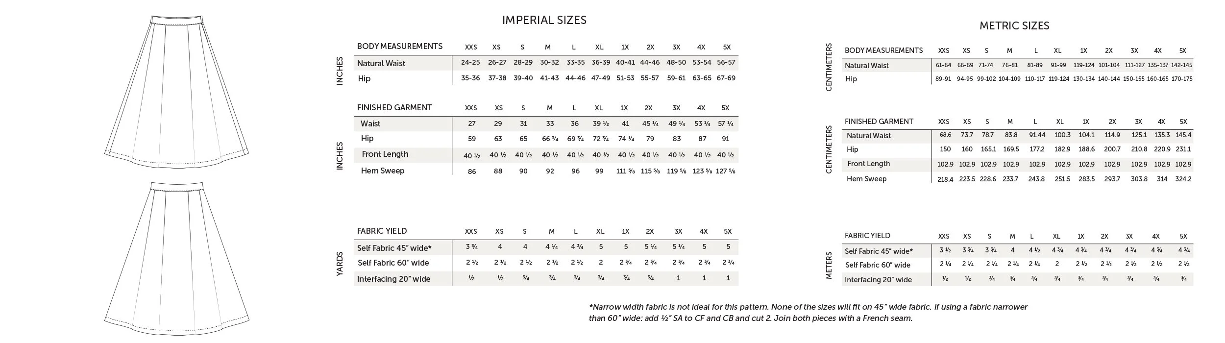 Fabric suggestions: For the best results in maintaining this pattern’s silhouette, choose a medium-weight woven fabric with a crisp hand. Fabrics like cotton twill, linen, wool, seersucker, gabardine, or structured cotton blends will give the box pleats definition and help the skirt maintain its intended silhouette —full at the sweep while staying smooth and fitted at the waist. Softer, fluid fabrics like rayon challis, lightweight chambray, or cotton lawn will create a more relaxed, straight silhouette as the pleats release and the fabric falls closer to the body. For a lighter-weight option that still maintains structure, look for gauzy fabrics with texture.Helpful links: